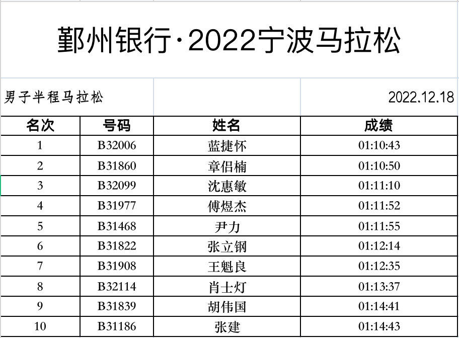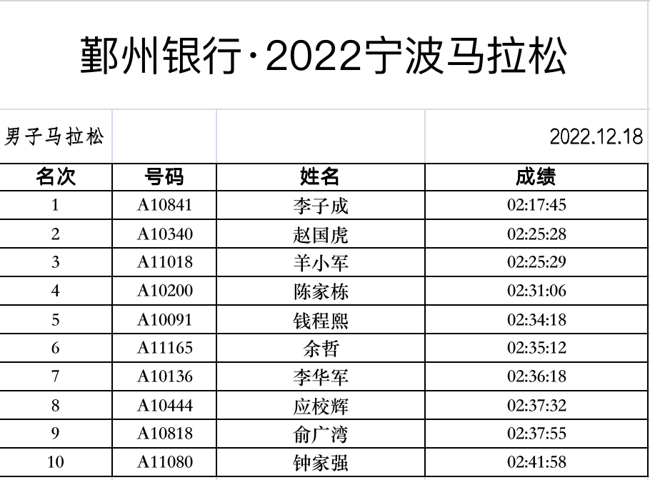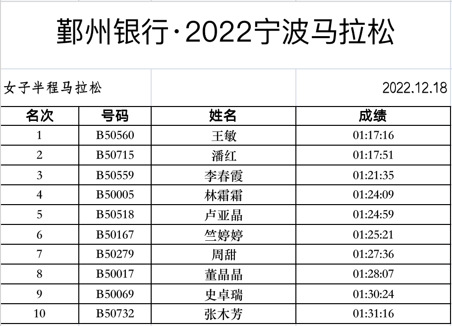 根据《2022宁波马拉松竞赛规程》,现对本届赛事马拉松马拉松、半程马拉松前十名获奖选手进行成绩公示,公示期为10日(即2022年12月19日至12月28日)。